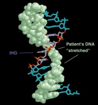 To take advantage of the progress made in these disciplines, there is a requirement for accurate, rapid and easy to use diagnostic methodology. IHG Pharmaco has developed a patented technology using induced heteroduplex generators (IHG) to screen for SNPs. The basic principle of the technology are shown in the illustration below, which shows a model of a gene with a mutation specific for an inherited genetic disease. One of the two strands of the patient’s DNA (shown in green) has been replaced with a “mimic” strand of DNA an induced heteroduplex generator (IHG). This stretches the conformation of the patient’s DNA in the region where the genetic defect is located. The 4 bases used to induce heteroduplexes in the helix are shown in the middle with individual atoms multicoloured.