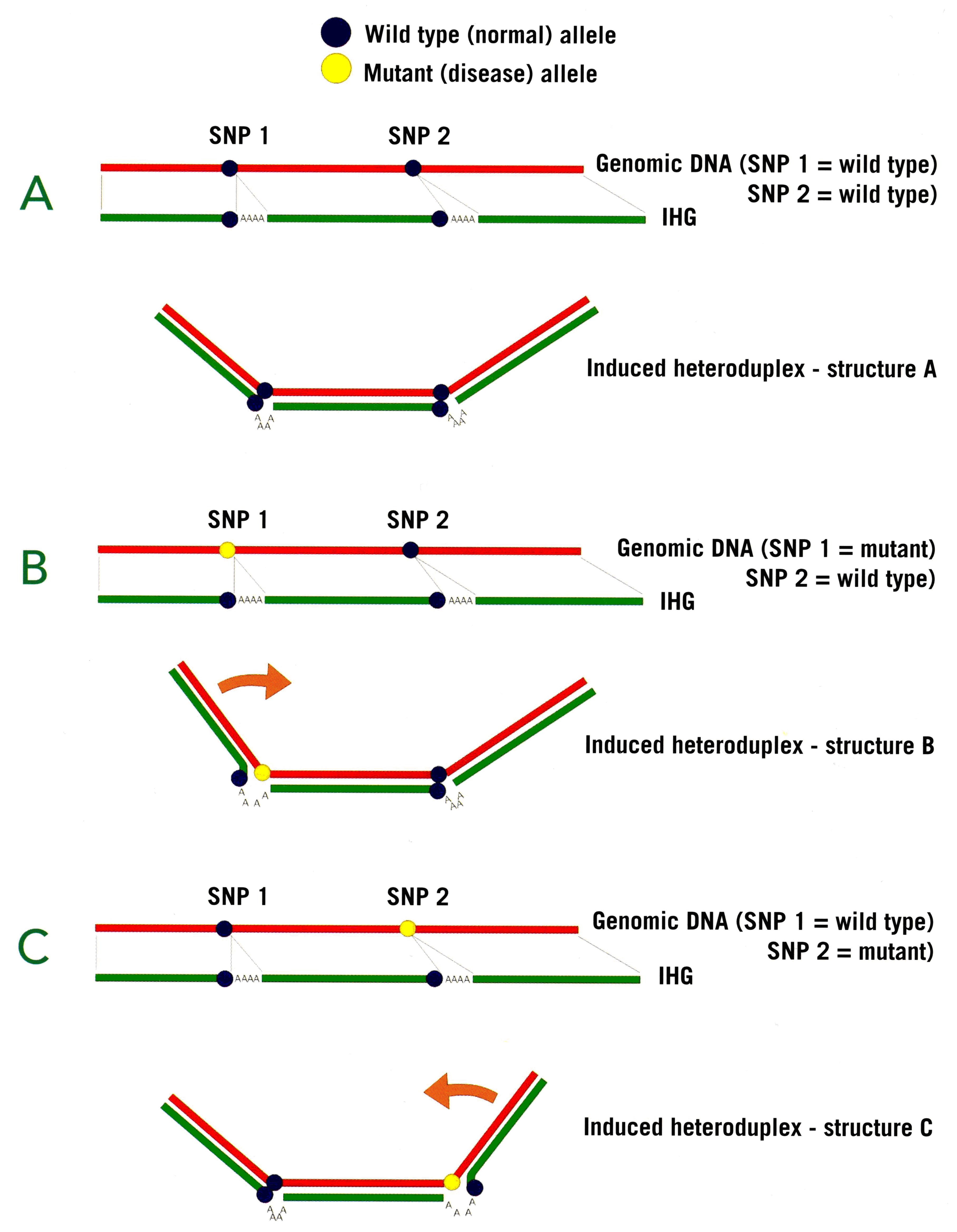 In the example above, a single IHG can detect 2 SNPs present within the same amplified region of DNA (shown in red). The wild type (normal) sequence at each of the SNPs is shown in blue, the mutant (disease) sequence is shown in yellow (see panels B and C). The 3-dimensional conformation of the heteroduplexes formed with the IHG differ (shown by different angles of the “arms”) according to whether a wild type or mutant sequence is present at one or other SNP sites.