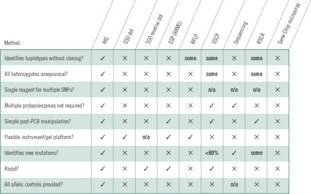 Current methods for the detection of SNPs include the following: 1. SSO (Sequence Specific Oligonucleotide) Dot 2. SSO (Sequence Specific Oligonucleotide) Reverse Dot 3. SSP (ARMS): Sequence-Specific Primers 4. RFLP (Restriction Fragment Length Polymorphism) 5. SSCP (Single 7. Reference 8. Gene Chip Microarray/Microarray Sequencing The above methods are often intensive, expensive, time-consuming and imprecise. They are also frequently dictated by the availability of existing equipment platforms. More fundamentally extant tests are unable to determine what haplotypes an individual possesses (see above). How can a single IHG reagent identify 2 or more individual SNPs and haplotypes?