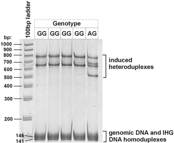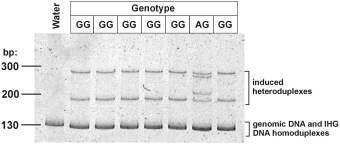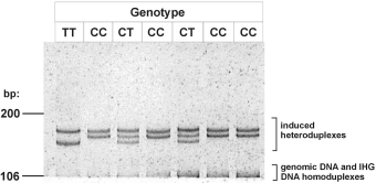 (Above) Polyacrylamide gel electrphoresis (PAGE) readout for Factor V Leiden genotyping using IHG.