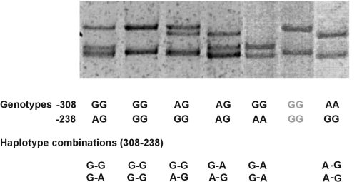 (Above) Example 1. Tumour necrosis factor a (TNF; TNFSF2) SNPs -308 G>A (rs1800629) and -238 G>A (rs361525) (3 haplotypes)